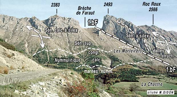 Les pentes les plus septentrionales du Pic Pierroux se terminent en éperon par le petit sommet du Faraut (point coté 2233). Ses abrupts montrent, toujours au sein de la succession des couches conglomératiques de la base du Nummulitique, d'autres détails stratigraphiques intéressants car ils témoignent d'une activité tectonique synsédimentaire mettant en jeu des cassures mineures (sans doute des accidents satellites du grand linéament d'Aspres-lès-Corps).