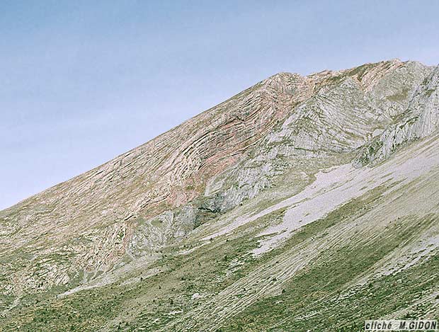 de Saint-Étienne dessinent une inflexion qui fait qu'elles sont de plus en plus redressées vers le bas du versant, où elles s'enfoncent pour cette raison sous leur couverture de Nummulitique. |