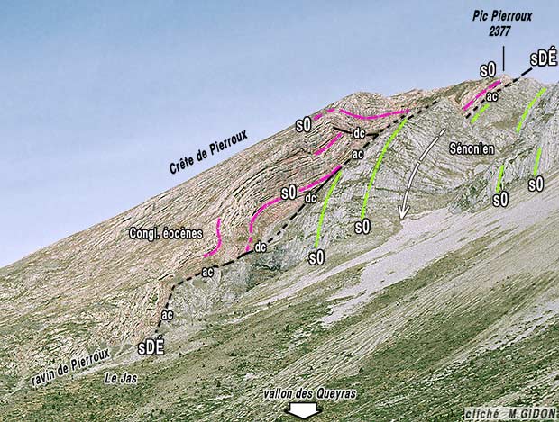 ![]() Le versant occidental de la crête de Faraut (extrémité nord) vu du sud-ouest, depuis la route pastorale du vallon des Queyras. DÉ = surface de discordance du Nummulitique. Les tirets roses soulignent la stratification ("s0") des couches éocènes, qui reposent globalement en "onlap"* sur la surface de transgression. Les tirets verts montrent que les couches du Sénonien sont coupées en biseau vers le haut. On a noté "dc" les zones de forte discordance et "ac" celles où il y a accordance* des pendages. L’épaisseur, exceptionnellement forte, des lits de brèches, conglomérats et marnes rouges de la base du Nummulitique indique que l'on se trouvait sans doute ici au pied d'un relief. La géométrie sédimentaire visible sur le cliché montre en outre que ce relief résultait de ce que les couches antérieurement déposées avaient subi un basculement vers l'ouest et que l'érosion y coupait, de ce fait, des niveaux de plus en plus profonds en direction de l'est : cela s'accorde bien avec le fait que, plus à l'est encore, sur les crêtes de la rive orientale du Champsaur, les couches nummulitiques reposent sur le Jurassique et même sur le socle cristallin (voir la page "Champsaur"). |