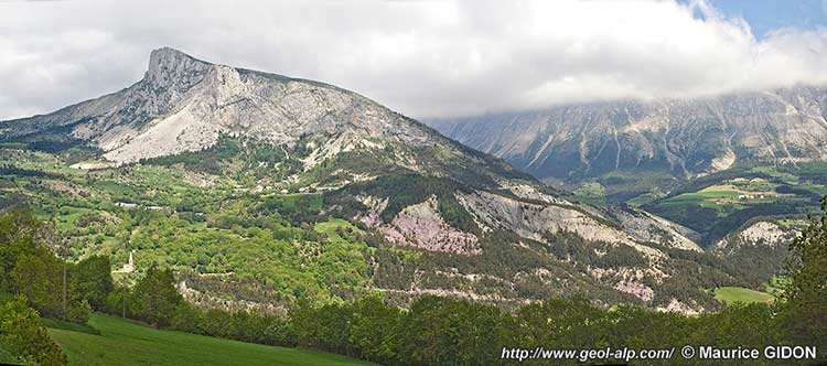 - Une fracturation extensive affectant le revers est de la montagne. Elle s'est produite durant le Nummulitique et a causé des effondrements de la lèvre nord-ouest, soulevée, de la faille, dont l'autre lèvre s'abaissait plus ou moins bas sous la surface de la mer. Ces effondrements ont eu pour effet la mise en place, sur l'abrupt de faille qui regardait vers le sud-est, d'olistolites* de matériel Sénonien (au sud du col de l'Aup), ainsi que, plus généralement (au nord du col de l'Aup et au sud du village de Gicon) d'importants amas conglomératiques.