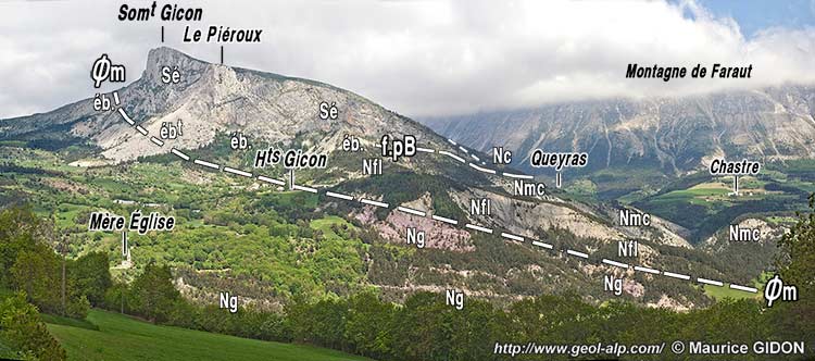 ![]() Coupe simplifiée de l'extrémité NE du Dévoluy par M. GIDON (extrait de la légende de la carte au 1/50.000° Saint-Bonnet) (coupe orientée de la même façon que le cliché ci-dessus). |