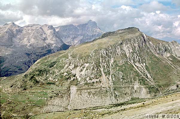 Le versant oriental de la Montagne du Gicon tombe sur le vallon des Queyras, qui est un val* ouvert par l'érosion du coeur de marnes nummulitiques du synclinal de l'Aup.