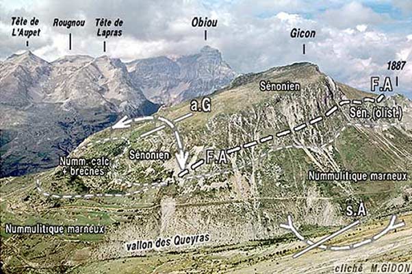 Le versant sud-est de la montagne du Gicon vu du sud-est, depuis les pentes nord de la brèche de Faraut (le nord est vers la droite). a.G = anticlinal du Gicon ; s.A = synclinal de l'Aup ; F.A = faille (extensive) de l'Aup (noter qu'en direction du sud elle se fait cacheter par le Nummulitique marneux) Sén. (olist.) = lames de Sénonien (olistolites) interstratifiées dans les calcaires nummulitiques plaqués sur la faille (voir plus de détails à la page "Pic Grillon"). |