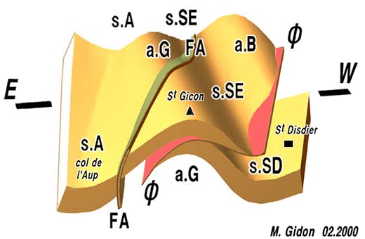 s.A = synclinal de l'Aup ; a.G = anticlinal du Gicon ; s.SE = synclinal de Saint-Étienne ; aB = anticlinal de Bure et s.SD = synclinal de Saint-Disdier. |