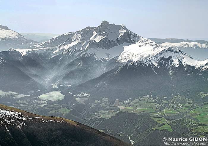 Vu du côté oriental, notamment depuis les deux rives de la vallée du Drac (par exemple depuis la N.85 au nord de Corps), le sommet de l'Obiou (2789 m) apparaît comme une splendide étrave rocheuse, s'avançant en promontoire vers le nord au dessus du sillon subalpin.