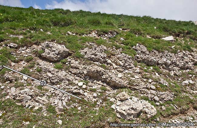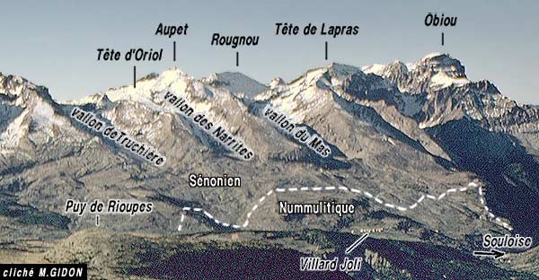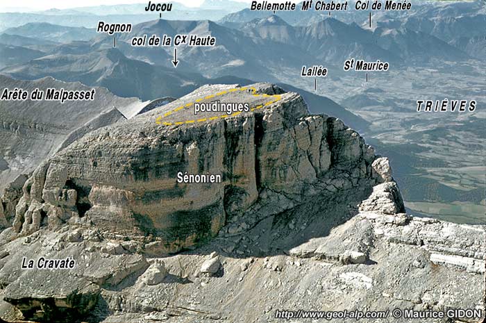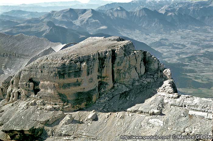 sommitale de l'Obiou montre d'abord combien sa structure est simple, pratiquement monoclinale, avec un pendage modéré de toutes les couches. Ce pendage est celui du flanc ouest du synclinal de Saint-Disdier, dont l'Obiou ne représente finalement qu'un fragment (en forme de volet* isolé par l'érosion). C'est pourquoi les falaises de l'Obiou s'abaissent progressivement vers le sud-est de façon continue, en dépit des incisions capricieuses de l'érosion, jusqu'au niveau du lit de la Souloise (voir la page "Basse Souloise" ).