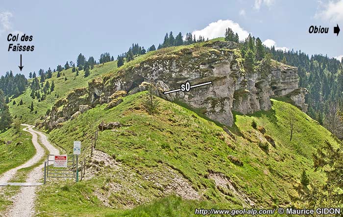 En contrebas oriental du sommet de l'Obiou se développe l'important replat d'alpages du col des Faïsses. Celui-ci est constitué, assez paradoxalement compte tenu de son altitude supérieure à 1600 m, par une vaste nappe de cailloutis qui s'étend sur plus de 1 km d'ouest en est et plus de 500 m au nord du col.