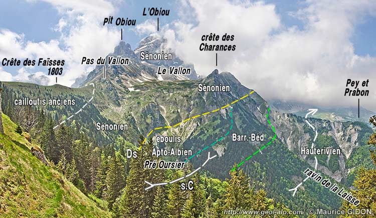 Les arêtes sommitales de l'Obiou ainsi que la crête de Rattier, qui prolonge de plus de 1 km vers le nord l'éperon rocheux de la crête principale de partage des eaux, sont entièrement formés par les calcaires du Sénonien. Par contre du côté sud-oriental, au nord de la falaise puissante et continue qui, depuis la Tête de Lapras, rejoint le défilé de la Souloise (voir page"Saint-Disdier") l'érosion a dégagé le soubassement oriental de cette crête : celui-ci, formé par le Crétacé inférieur marno-calcaire et surtout par les calcaires de la barre Tithonique, donne un relief de mamelons boisés séparés par de profonde ravines (Jenabran, ravin de la Laisse).