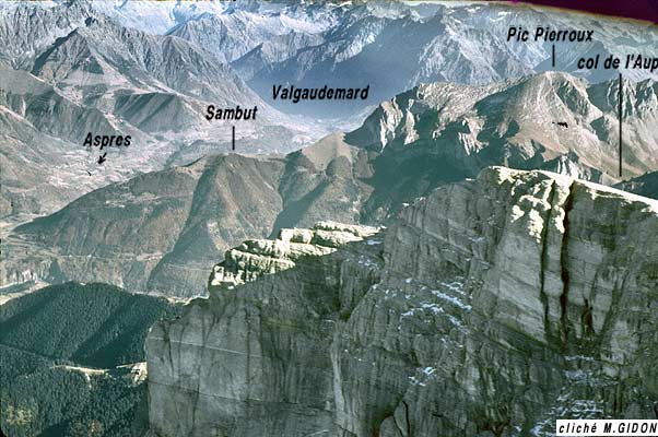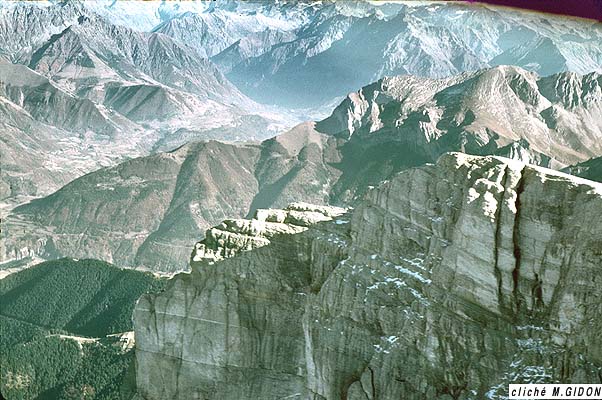 ![]() L'extrême sommet de l'Obiou, vu d'avion, de l'ouest Cette vue montre, en arrière-plan, le rebord septentrional de la dalle sénonienne qui cerne la cuvette du Dévoluy (voir la page "Sambut"). Les falaises septentrionales du Pic Pierroux semblent prolonger celle du sommet de l'Obiou, ce qui est vrai à ceci près que, entre les deux, passe la vallée de la Souloise. Cela montre en outre que les unes et les autres gagnaient en altitude de façon similaire vers la gauche, c'est-à-dire vers le nord, où l'on se dirige en effet vers la zone surélevée du Dôme de La Mure. Ce relèvement des couches vers le nord les exposait de plus en plus à l'érosion, alors qu'elles ont été conservées plus au sud, où elles s'abaissaient jusqu'au cœur de la cuvette du Dévoluy. |