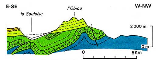 Toutefois, à l'Obiou l'inclinaison des couches n'est plus orientée vers l'est, comme au sud de Saint-Disdier, mais franchement vers le sud-est : cette inflexion d'azimut est due au relèvement axial vers le nord qui affecte ici le pli (ce qui se traduit également par un surhaussement progressif, du sud vers le nord, des couches du soubassement anté-Sénonien).