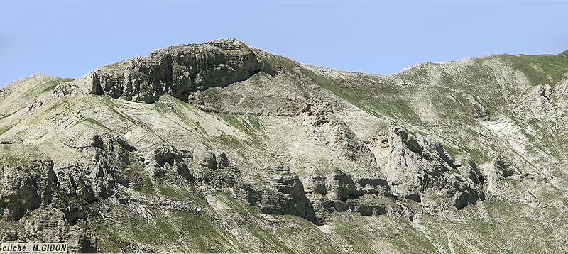 Or cette galette de Sénonien bascule presque à l'envers et repose sur les couches nummulitiques du versant ouest de la crête par une surface qui est inclinée vers le vallon (de sorte qu'elle est disposée à la façon d'un béret posé sur le côté de la tête).