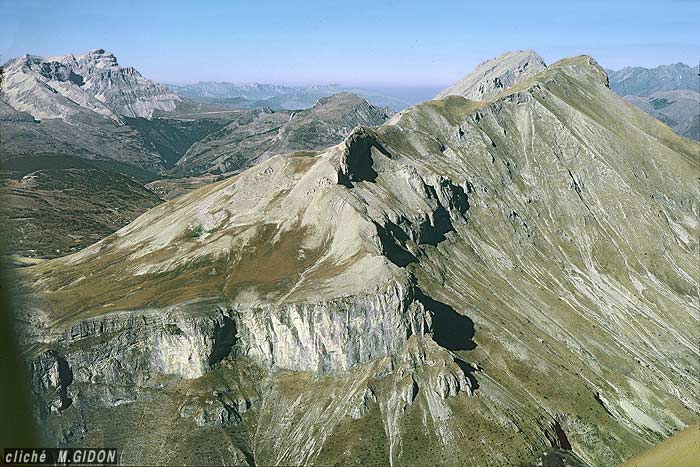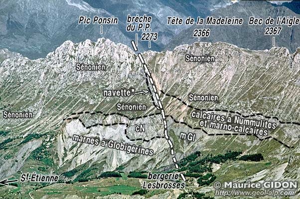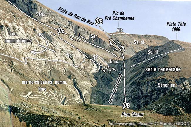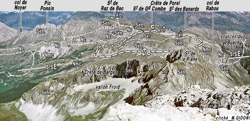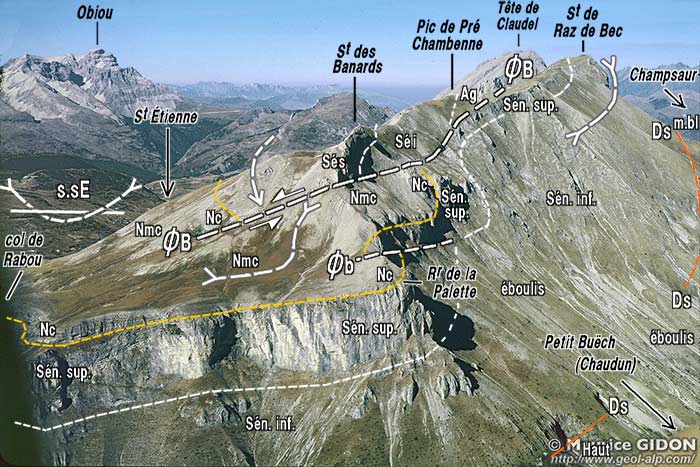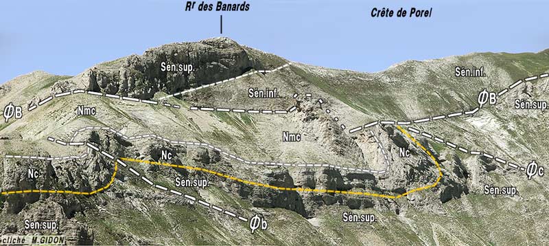 ![]() Le versant est de la crête de Porel - Raz de Bec, vu des pentes nord-orientales du Pic Mélette. ØB = chevauchement principal des Banards (le tracé dans le ciel, sur la droite matérialise l'hypothèse selon laquelle il se prolonge vers l'est par le chevauchement du col de Chétive (voir page "Chaudun"), au prix d'une torsion antiforme. Øb, Øc = chevauchements satellites secondaires. DS = surface de discordance du Sénonien ; A.gr = grès verts de l'Albien supérieur ; Sé.i = Sénonien inférieur (Turonien). |