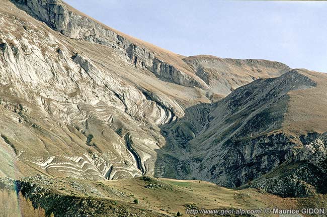 On peut penser que l'effort de serrage cisaillant qui a créé le chevauchement a été induit par l'avancée des nappes de l'Embrunais. Son basculement, et le plissement N-S qui en est la cause, sont très probablement liés au soulèvement final du massif du Pelvoux (plus récent par conséquent). Il est remarquable qu'un dispositif qui semble relever de la même explication s'observe plus au nord dans les pentes orientales de la crête de Faraut (voir la page "Chauffayer") ainsi qu'à la montagne de Gicon. |