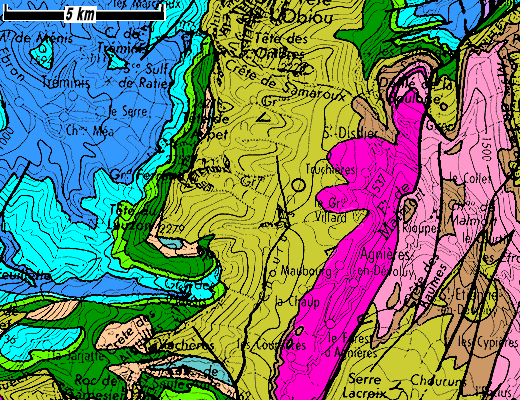 En amont du village, sur la rive gauche de la vallée d'Agnières (torrent de la Ribière) les premières couches tertiaires sont par contre constituées par les Grès de Saint-Disdier, de type molassique*, qui reposent directement, en faible discordance* sur les calcaires sénoniens.