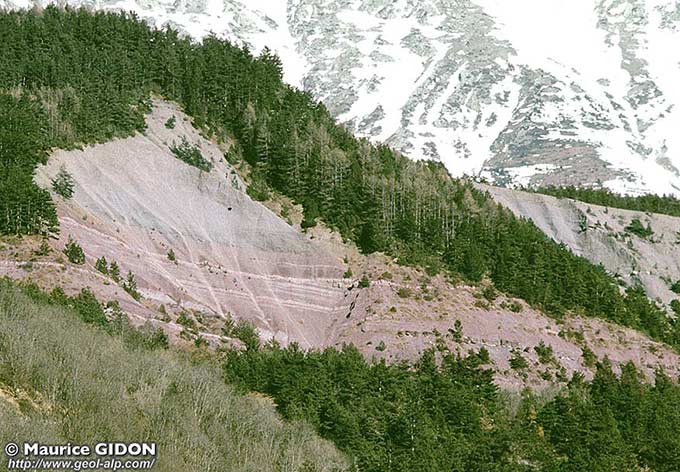 Les grès de Saint-Disdier, d'abord verdâtres, passent vers le haut au faciès "molasse rouge" (faciès à affinités continentales) en s'intriquant entre des lits de marnes de plus en plus rougeâtres. En allant vers l'est (Gicon et vallon des Queyras) ces grès disparaissent et font place à d'épais marno-calcaires nummulitiques marins qui prennent vers le haut un faciès de flysch très marneux à petits bancs de grès (faciès à affinités marines).