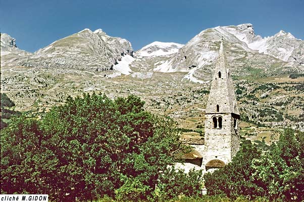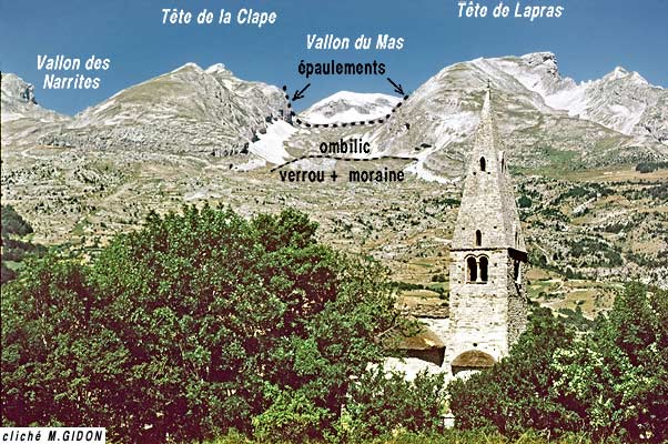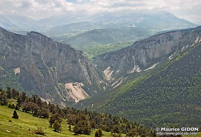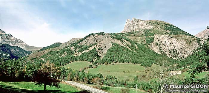 La Mère-Église, devant les pentes du versant occidental de la vallée de la Souloise. vue prise de l'est, depuis les pentes de rive droite de la Souloise, au dessus de Saint-Disdier. La pente douce, plus colonisée par la végétation, en aval du verrou correspond à la dalle de calcaires nummulitiques du flanc ouest du synclinal de Saint-Disdier. |