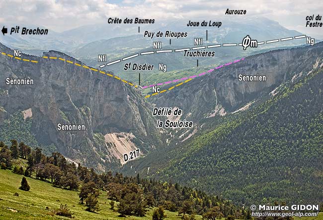 Par contre la Souloise elle-même a un tracé oblique à ce pli et suit approximativement l'axe du synclinal NW-SE de Saint-Étienne : ce dernier traverse obliquement les plis N-S successifs et détermine notamment un ensellement* de la voûte des calcaires nummulitiques de l'anticlinal N-S du Gicon (qui remonte plus au sud en direction du plateau de Bure). Cet abaissement s'ajoute au redoublement de succession occasionné par le chevauchement du Gicon pour que le cours de la rivière ne montre que des affleurements du Nummulitique et ne parvienne pas a atteindre la dalle du Sénonien avant l'entrée aval des gorges de Saint-Étienne.