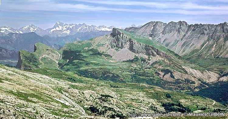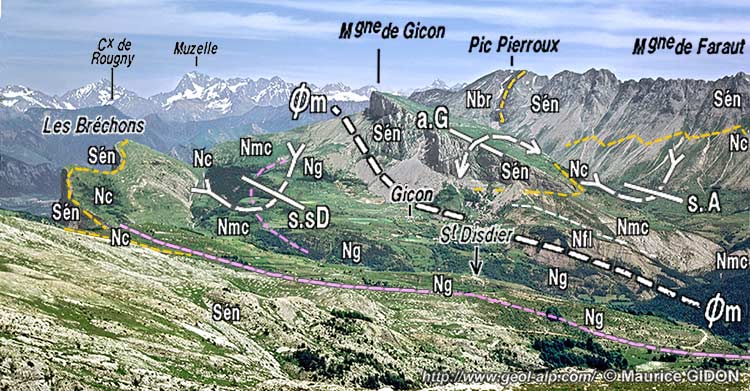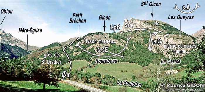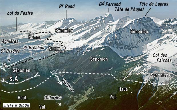 ![]() Coupe simplifiée de l'extrémité NE du Dévoluy par M. GIDON (extrait de la légende de la carte au 1/50.000° Saint-Bonnet) |