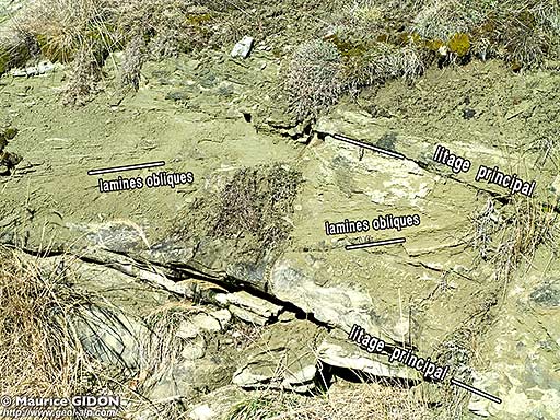 ![]() Grès de Saint-Disdier : faciès sableux à litages obliques D.937, au sud de Saint-Disdier, en aval de l'embranchement de la route du Grand Villard. |