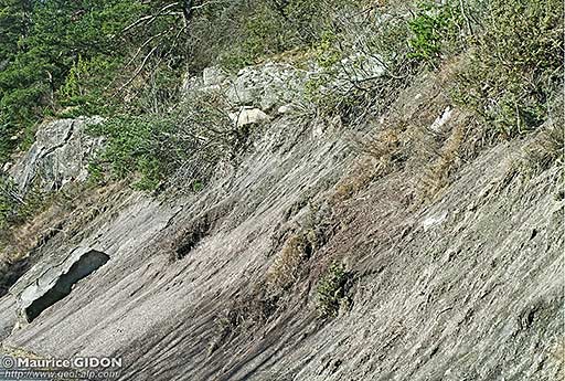 ![]() Grès de Saint-Disdier : Bancs de grès durs, de teinte gris-verdâtre, intercalés de lits de marnes rubescentes D.937, 1,5 km au sud de Saint-Disdier. |