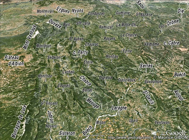 En haut à gauche le bassin miocène rhodanien (dépôts tertiaires en jaune); en bas à droite la dépression de Laragne (entre Buëch et Durance), où l'érosion a mis partout à nu les Terres Noires jurassiques (en bleu). En vert clair les couches essentiellement marneuses du Crétacé moyen et supérieur.