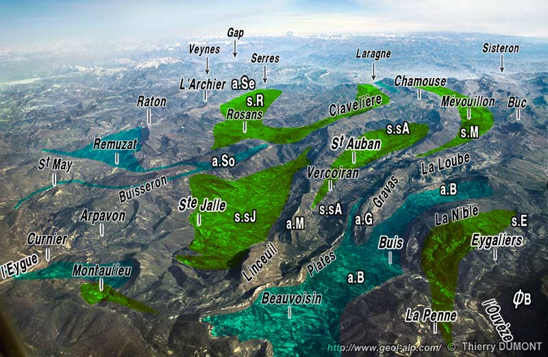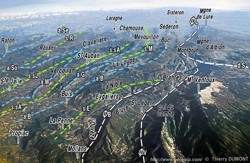 a.Se = anticlinal de Serres ; s.R = synclinal de Rosans ; a.So = anticlinal de Soubeyran ; s.sJ = synclinal de Sainte-Jalle ; a.M = anticlinal de Montlaud ; s.sA = synclinal de Saint-Auban ; a.G = anticlinal de Gravas ; s.M = synclinal de Mévouillon ; a.B = anticlinal du Buis ; s.E = synclinal d'Eygaliers ; ØB = chevauchement de Bluye ; ØV = chevauchement du Ventoux ; ØL = chevauchement de Lure ; d.S = décrochement de Sault.