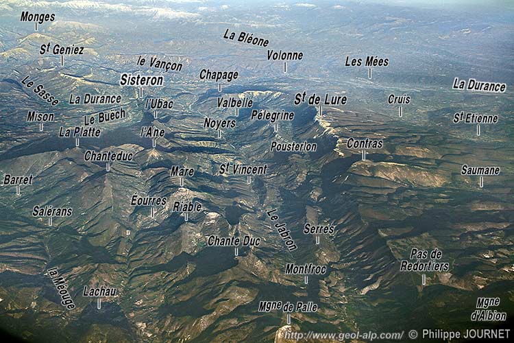 La partie occidentale des Baronnies méridionales et le chaînon de Ventoux-Lure : vue d'ensemble, d'ouest en est, depuis un avion de ligne (cliché original obligeamment communiqué par M. Th.Dumont).