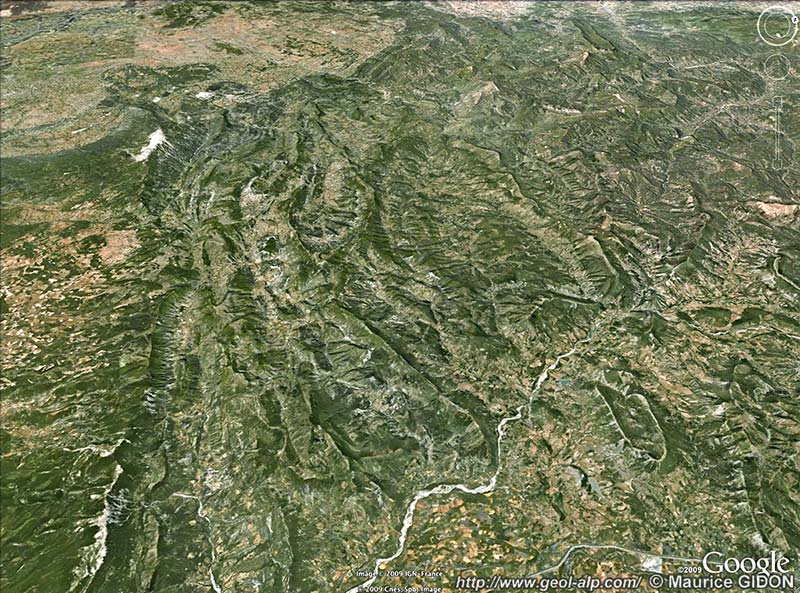 La vue ci-après complète les deux précédentes en montrant la partie orientale des Baronnies méridionales et ses rapports avec la marge occidentale du Pays Dignois (on en trouvera des extraits, agrandis et commentés du point de vue géologique, dans plusieurs pages locales) :