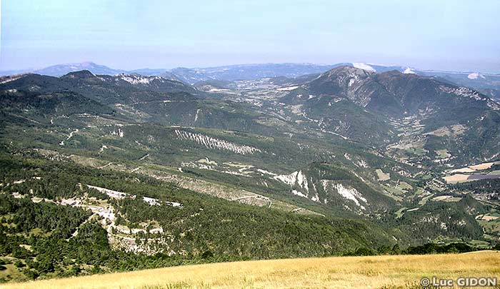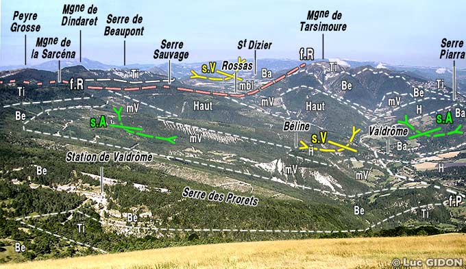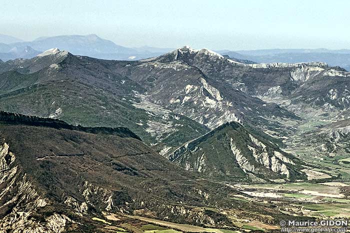 ![]() Le val de L'Épine (partie orientale) vu de l'est, depuis l'aplomb de la vallée du Buëch (Le Bersac) La portion du cours de la Blème qui coupe la succession du Crétacé inférieur au voisinage de Montclus est masquée derrière la corniche tithonique de la crête de l'Eyglière. d.M = décrochement de Maraysse |