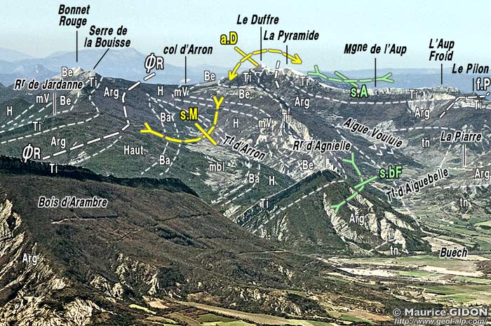 La longue crête du Serre de la Bouisse domine du côté nord le vallon d'Arron, dont le torrent suit ent les affouillant les marnes bleues du cœur du synclinal de Montmorin : le Jurassique des pentes supérieures du versant nord de la crête repose sur le Barrémien du flanc sud du synclinal par l'intermédiaire du chevauchement de Raton (mais ce contact tectonique est presque partout masqué sous la couverture forestière). Ici l'anticlinal des Tourettes (c'est-à-dire le crochon* du compartiment chevauchant) manque, complètement enlevé par l'érosion (à la différence de ce qui se passe à l'ouest du col d'Arron).