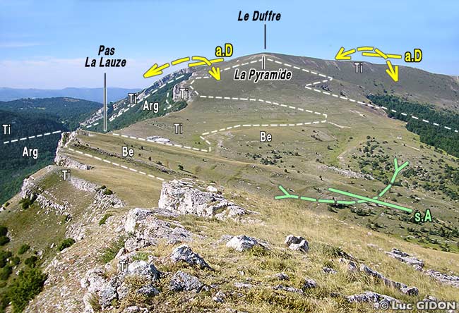 À l'ouest du sommet, au contraire, le Tithonique de la voûte anticlinale est essentiellement décapé par l'érosion, en un mont* jurassien qui s'abaisse doucement vers l'ouest pour constituer la Crête de la Sarcéna. Toutefois, entre le Duffre de son antécime nord, La Pyramide, 1734 m., la charnière anticlinale est crevée jusqu'à l'Argovien par un étroit vallonnement E-W (une faille extensive, sans doute antérieure au plissement, y abaisse même un peu le compartiment de La Pyramide.
