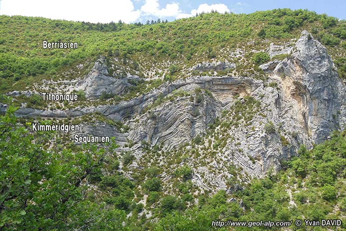 Ces couches du fond du grand synclinal sont à peu près horizontales, mais la coupe de la vallée y montre localement des plis mineurs qui offrent de spectaculaires exemples de plissement dysharmonique* (liés à la différence d'épaisseur des couches de différents niveaux superposés).