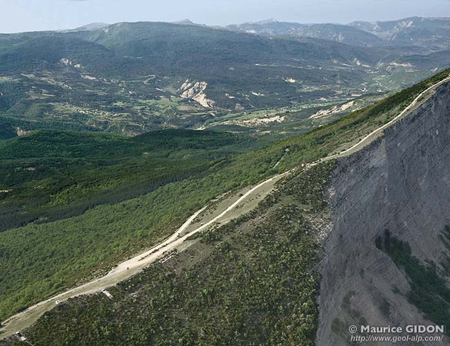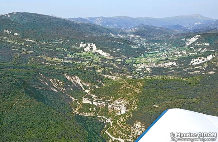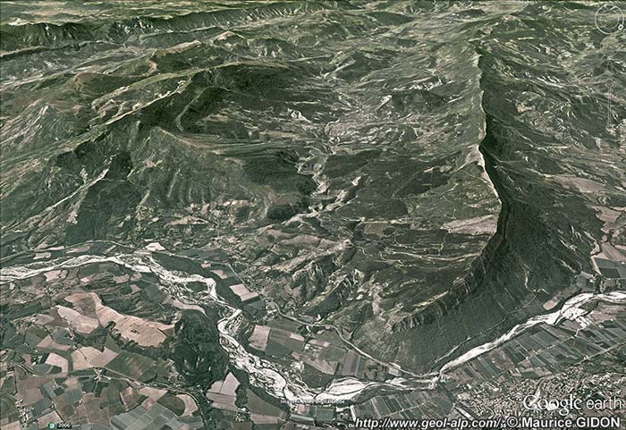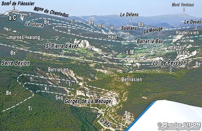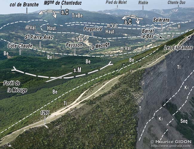 ![]() La crête orientale de la Montagne de Chabre et la vallée de la Méouge, vues du NE, d'avion (à l'arrière-plan : les crêtes des environs d'Eourres). a.C = anticlinal de Chanteduc ; s.M = synclinal de la Méouge. |