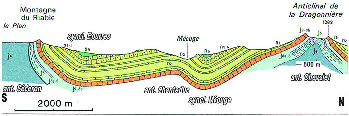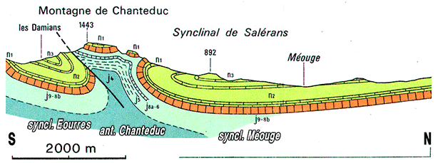 ![]() Coupe passant plus à l'ouest, entre Salérans et Lachau : l'anticlinal de Chanteduc est réduit à une ondulation du fait de son amortissement en direction de l'ouest et l'érosion de la voûte de l'anticlinal de Chevalet se réduit au point que le Crêt de Chabre (à gauche) se rapproche de celui, symétrique de Sainte-Colombe - Rocher de la Dragonnière. |