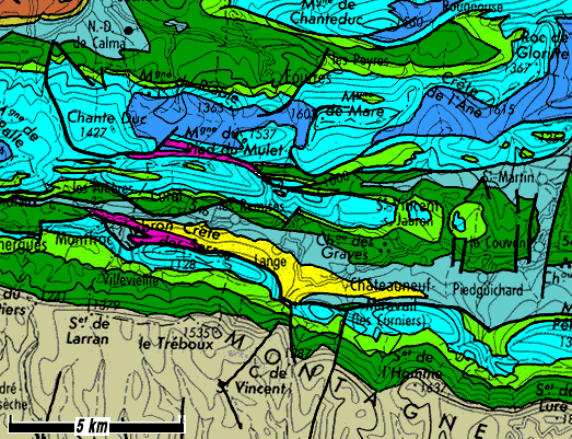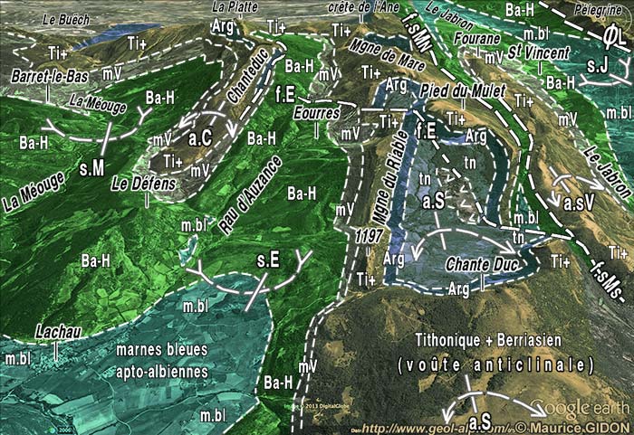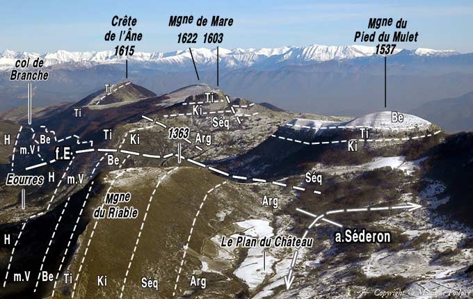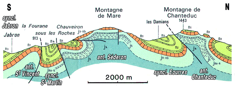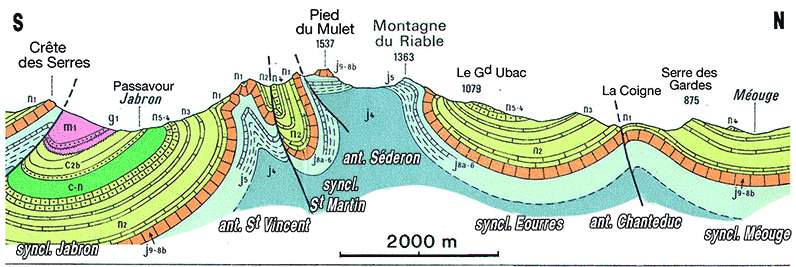 L'anticlinal de Séderon, plus méridional, ne forme un mont* jurassien à carapace tithonique que dans le tronçon correspondant à la montagne de Mare elle-même ; plus à l'est et surtout plus à l'ouest cette carapace est crevée en boutonnières montrant son cœur de Terres Noires ; cette disposition, très comparable à celle des environ de Séderon, est notamment réalisée à l'ouest d'Eourres, entre les deux crêtes de la Montagne du Riable et de celle du Pied du Mulet.