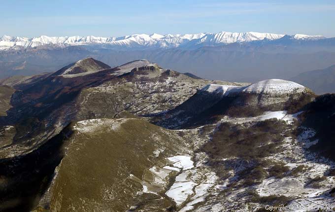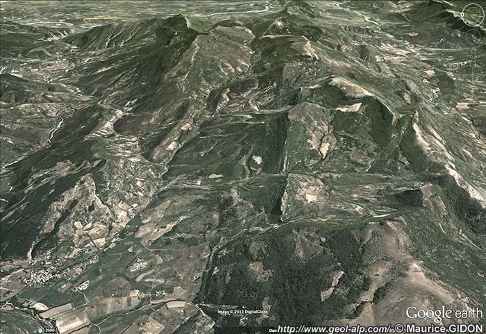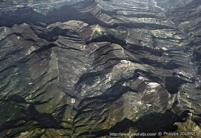 Les montagnes entourant la localité d'Eourres, vues de l'ouest depuis un avion de ligne (cliché original obligeamment communiqué par Mr. Ph. Journet) |