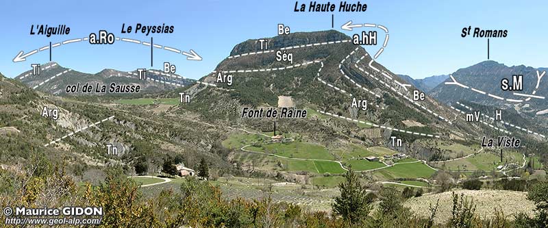 Les montagnes de sa rive droite (nord) appartiennent au corps de cet anticlinal majeur. Du côté ouest il est largement éventré, jusqu'à son coeur de Terres Noires, dans le vallon occupé par les hameaux de la commune de Rottier . Mais plus à l'est, à partir de la transversale de La Charce et du col des Arches, sa carapace de Tithonique tend à se reconstituer, en dépit des profondes entailles transversales des torrents d'Establet et des Arches, pour y créer un relief de "mont" jurassien* qui se poursuit par le Serre Embouc jusqu'au Serre de Beaupont (voir la page Valdrôme).