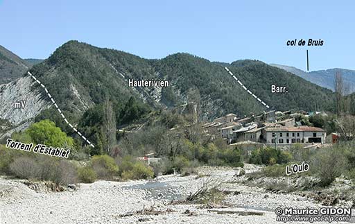 ![]() Le village de La Charce vu de l'ouest, un peu en aval du confluent de l'Oule et du Torrent d'Establet en arrière-plan le Néocomien du flanc sud de l'anticlinal de Rottier (= flanc nord du synclinal de Montmorin) |