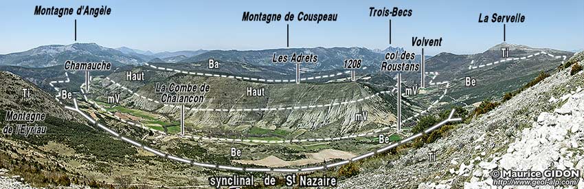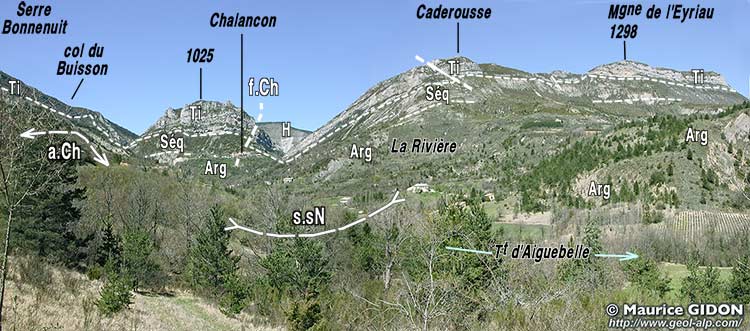 A l'ouest de Chalancon (sous le col du Buisson) le tracé cartographique de cette barre tithonique revient assez brutalement vers le sud, de sorte que, au total, elle dessine ainsi un important rentrant vers l'ouest : cela résulte de son ploiement par l'anticlinal de Chalancon, pli NW-SE dont la voûte tithonique a été largement crevée par l'érosion. L'axe de ce dernier pli plonge également vers le nord-ouest et il se prolonge presque sans complications, dans les couches du Crétacé inférieur, jusqu'aux abords occidentaux de Saint-Nazaire-le-Désert.