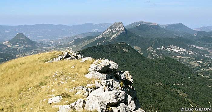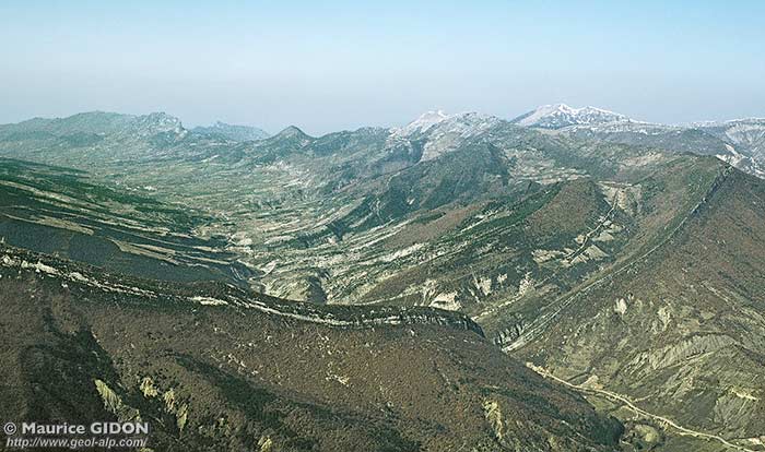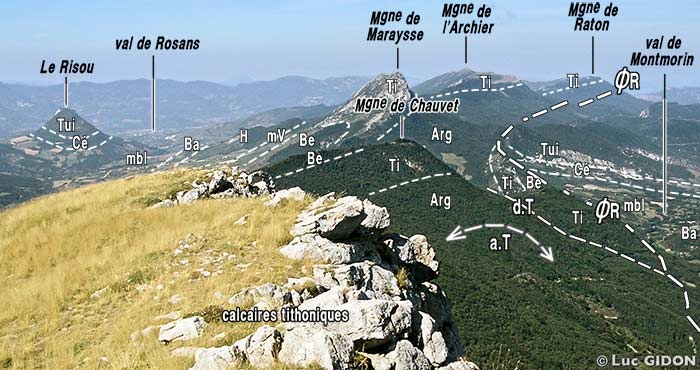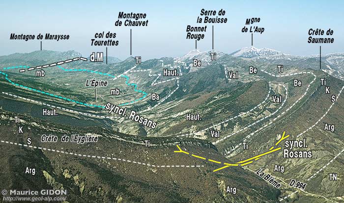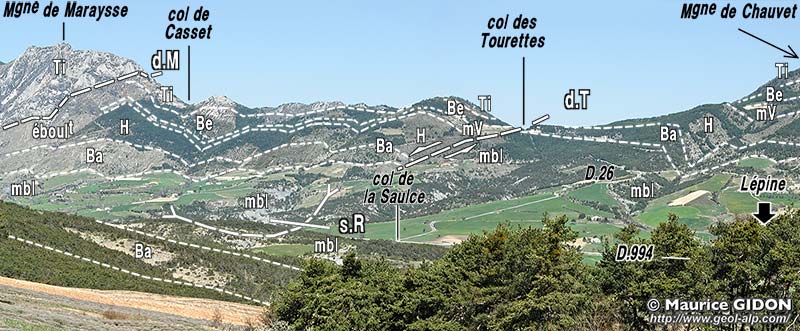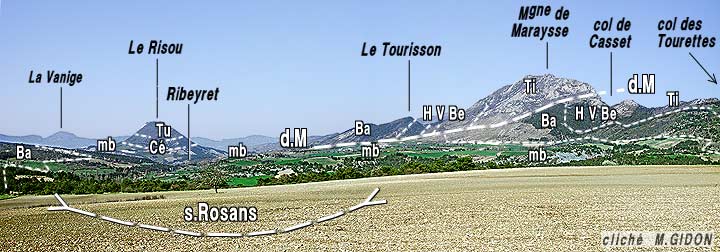 Les limites des couches successives du crétacé inférieur y courent à flanc de pente en dessinant des chevrons de V topographiques*. Elles sont décalées par endroits, dans le sens sénestre, par plusieurs petits décrochements sensiblement parallèles à celui de la montagne de Maraysse, c'est-à-dire orientés NE-SW ; ils déterminent notamment, sur la crête, le col des Tourettes et, plus à l'est, celui des Trousses.
