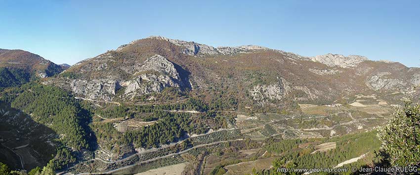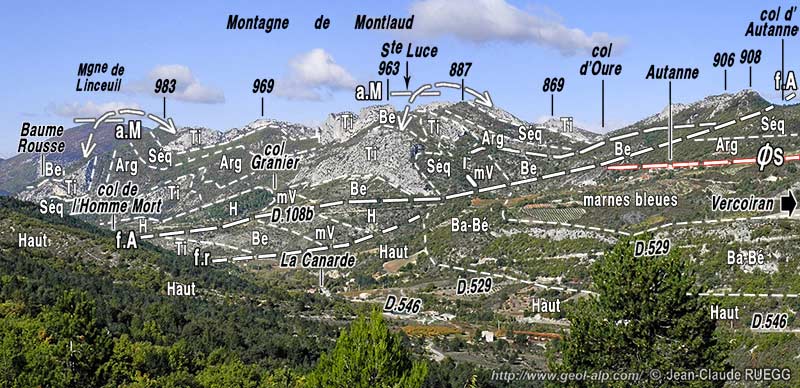 En effet la structure des pentes de rive droite de l'Ouvèze est franchement différente au nord-ouest de la faille d'Autanne de celle des abords orientaux de Vercoiran : le chevauchement de la Serrière s'y termine brutalement et, dans son prolongement, le Tithonique dessine au contraire les deux flancs et même, par places, la voûte de l'anticlinal de Montlaud.