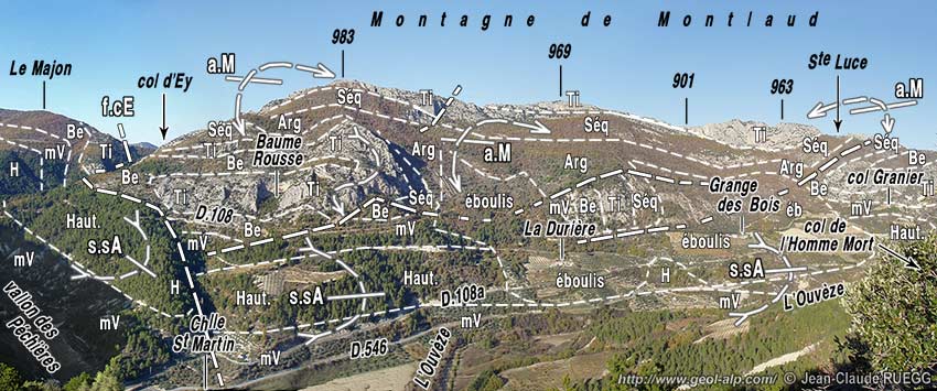 À la Chapelle Saint-Martin le cours de l'Ouvèze prend une direction orthogonale, N-S et la rivière franchit, par les gorges d'Ubrieux, le Tithonique du flanc sud du synclinal pour pénétrer dans l'anticlinal du Buis (voir la page "Le Buis"). Ce changement de direction est certainement en liaison avec le fait que le chaînon de Montlaud est traversé à cet endroit par la faille d'Ey, qui est une asez importante cassure de décrochement d'orientation NW-SE et de sens de rejet dextre.