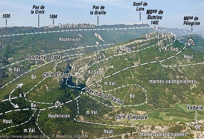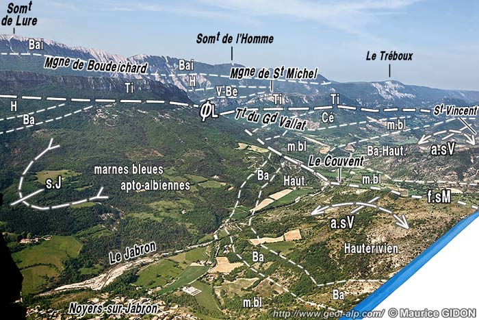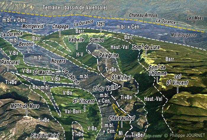 ![]() La vallée aval du Jabron et la montagne de Lure, vues de l'W-NW depuis un avion de ligne (cliché original obligeamment communiqué par Mr. Ph. Journet) . Ti-Be = Jurassique supérieur et Berriasien; V-Ba = Valanginien à Barrémien (faciès des Baronnies) ; Haut-Val = Hauterivien - Valanginien ; Barr. = Barrémo-Bédoulien à faciès provençal ; Mi = Miocène. Tectonique (du bas à gauche, en diagonale vers le haut à droite) : anticlinal de Séderon (Montagne de Mare), synclinal de Saint-Martin, anticlinal de Saint-Vincent, synclinal du Jabron, chevauchement de Lure, anticlinal de Valbelle (voir la carte structurale à la page "cartes"). |