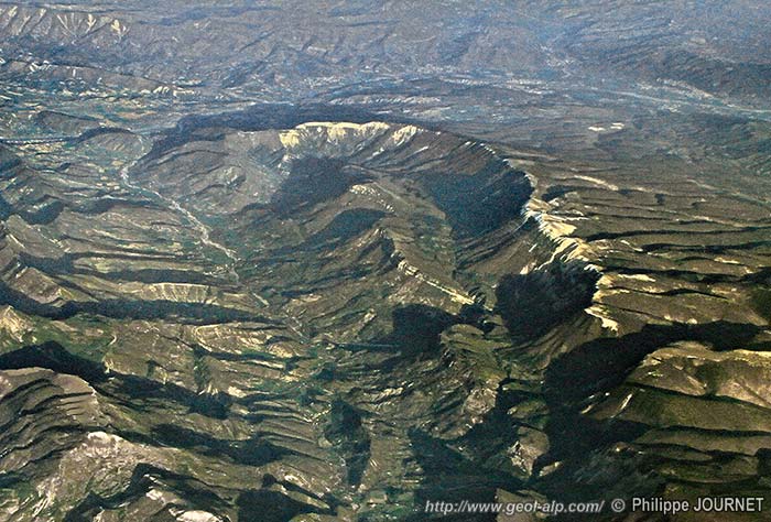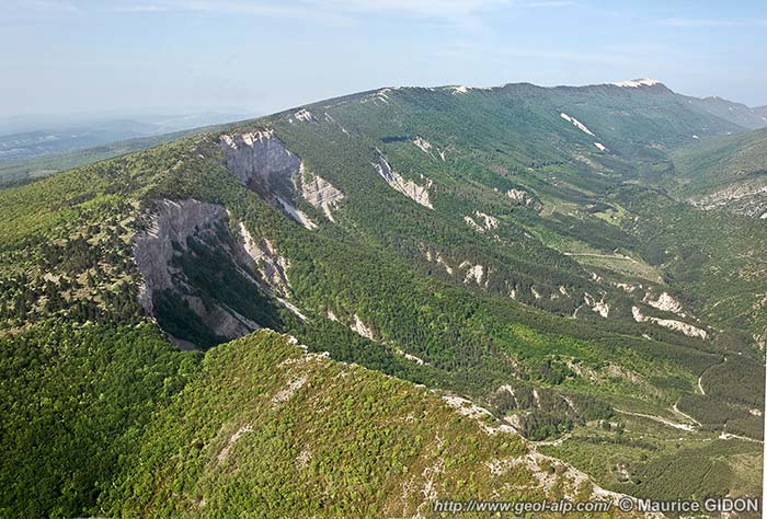 ![]() L'extrémité orientale de la cuesta supérieure de la Montagne de Lure, vue de l'est, d'avion. a.V = anticlinal de Valbelle. |