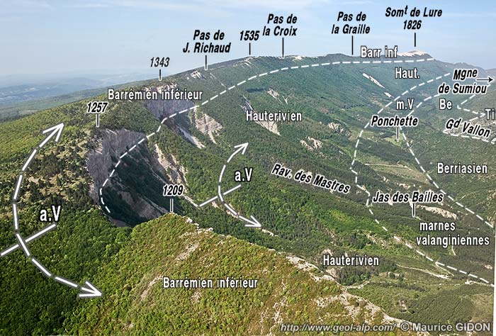 Ces couches représentent la tranche d'une puissante dalle monoclinale qui s'abaisse doucement vers le sud, avec un pendage régulier de l'ordre de 20°, pour se raccorder à celle les plateaux du Vaucluse. Cette tranche de couches repose sur celles du synclinal du Jabron par l'intermédiaire d'un chevauchement de Lure qui se situe, tout du long de la vallée, à la base du Tithonique (c'est cette disposition qui a occasionné la mise en relief du chaînon de Bure - Ventoux par surhaussement de la bordure septentrionale de la tranche chevauchante).