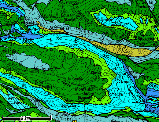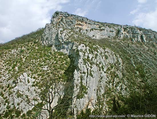 Mais il est à remarquer que ce pli, très ouvert et d'axe presque E-W n'a nullement été évidé sur toute sa longueur de la même façon : son contenu a été enlevé d'ouest en est par tranches successives, des plus récentes (Barrémien) aux plus anciennes (Tithonique). Cela est lié à l'inclinaison axiale du pli qui en surhausse progressivement le fond en direction de l'est.