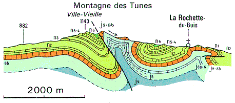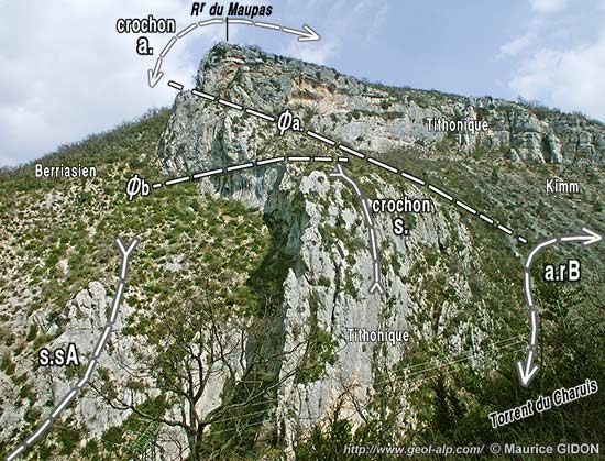 Ce pli est représenté (en orientation inverse) à la partie droite de la coupe ci-dessous ; il y apparaît assez clairement que l'on a là affaire à un pli presque "droit" (à plan axial sub-vertical) dont la charnière tithonique a été déformée par un cisaillement sub-horizontal :