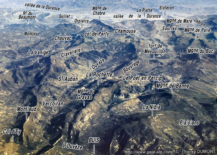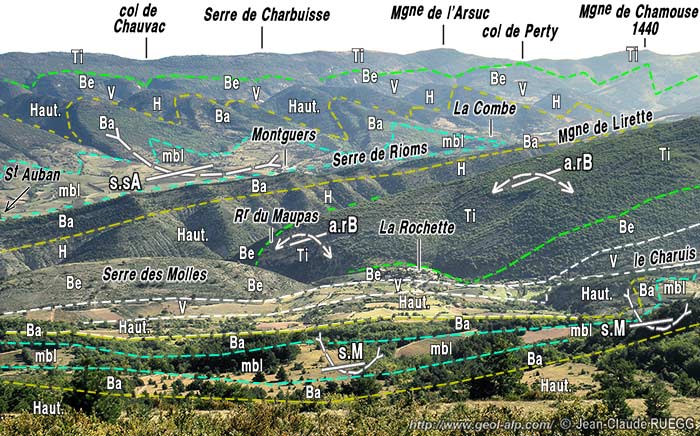 Ces crêtes correspondent l'une comme l'autre à des anticlinaux qui sont respectivement les prolongements orientaux de ceux de Montlaud et de la Rochette du Buis (l'axe de ce dernier prenant là une direction presque NW-SE). Mais l'un comme l'autre (surtout le premier d'ailleurs) sont rompus par des failles longitudinales qui tendent à les faire chevaucher, de façon d'ailleurs divergente, sur le contenu des synclinaux qui les jouxtent (savoir celui de Mévouillon au sud et celui de Chauvac au nord.