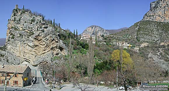 qui constitue la bordure sud d'un couloir de roches broyées, essentiellement constituées par de l'Argovien, prises entre deux épontes de Tithonique que l'érosion a souvent dégagé en formant de véritables murs naturels verticaux (bien visibles le long de la route qui monte au Prieuré du Plateau de Saint-Auban) bien caractéristiques d'un décrochement .