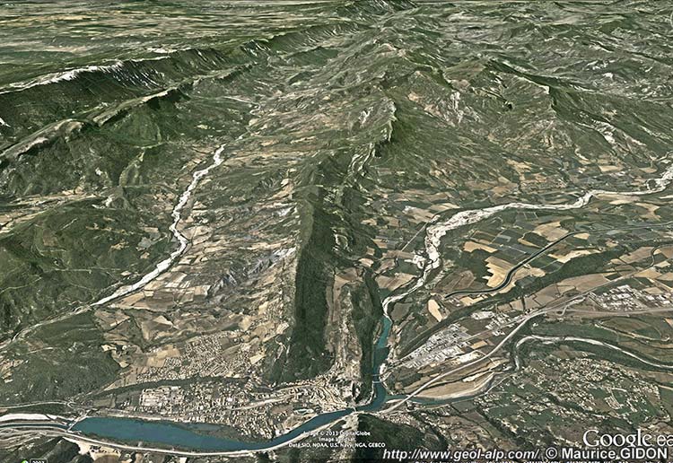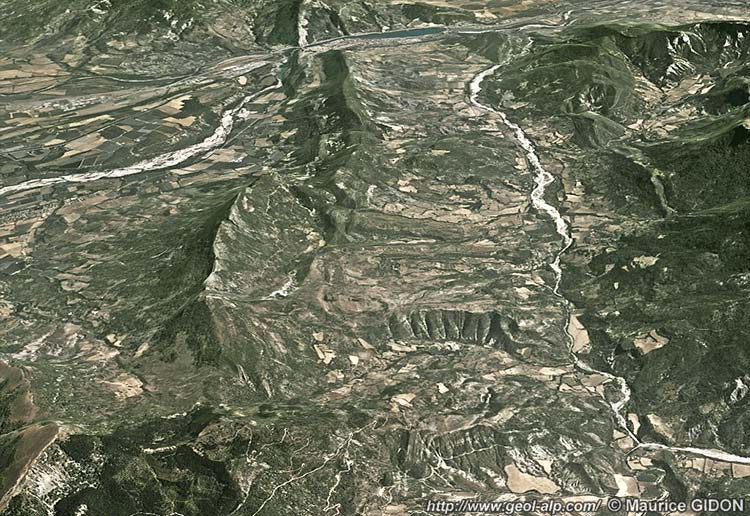 La rive droite (occidentale) de la Durance au niveau de Sisteron (vue pseudo-aérienne obtenueau moyen de "google-earth") .